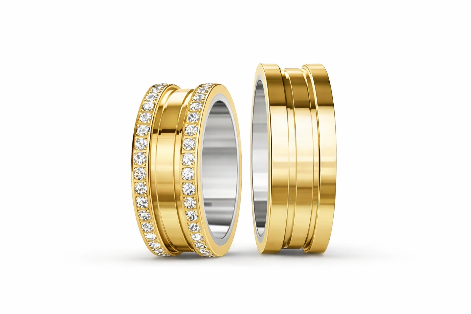Alianças em moeda com 8 mm de largura — uma delicadamente cravejada com zircônias, a outra com acabamento liso e elegante. Um par que representa a força e a beleza do amor verdadeiro.