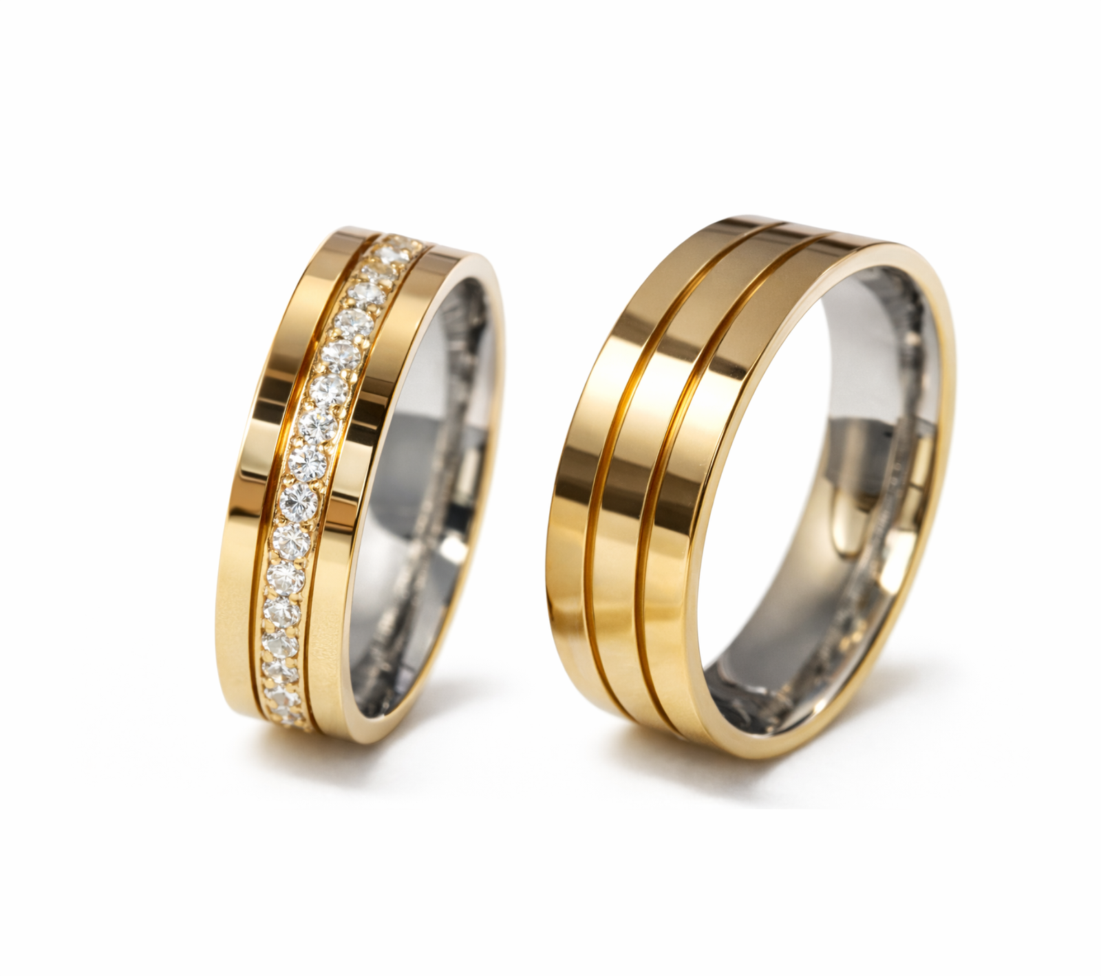 Um par de alianças que combina sofisticação e brilho na medida certa. O design com frisos paralelos e a cravação central trazem um visual elegante e atemporal, ideal para quem busca um símbolo de união com presença, estilo e acabamento refinado.