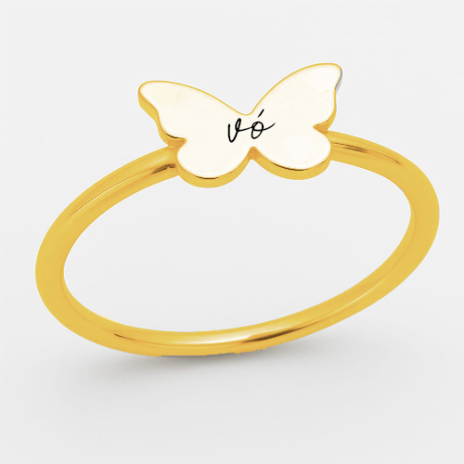 Anel com borboleta personalizada, disponível em ouro ou prata.